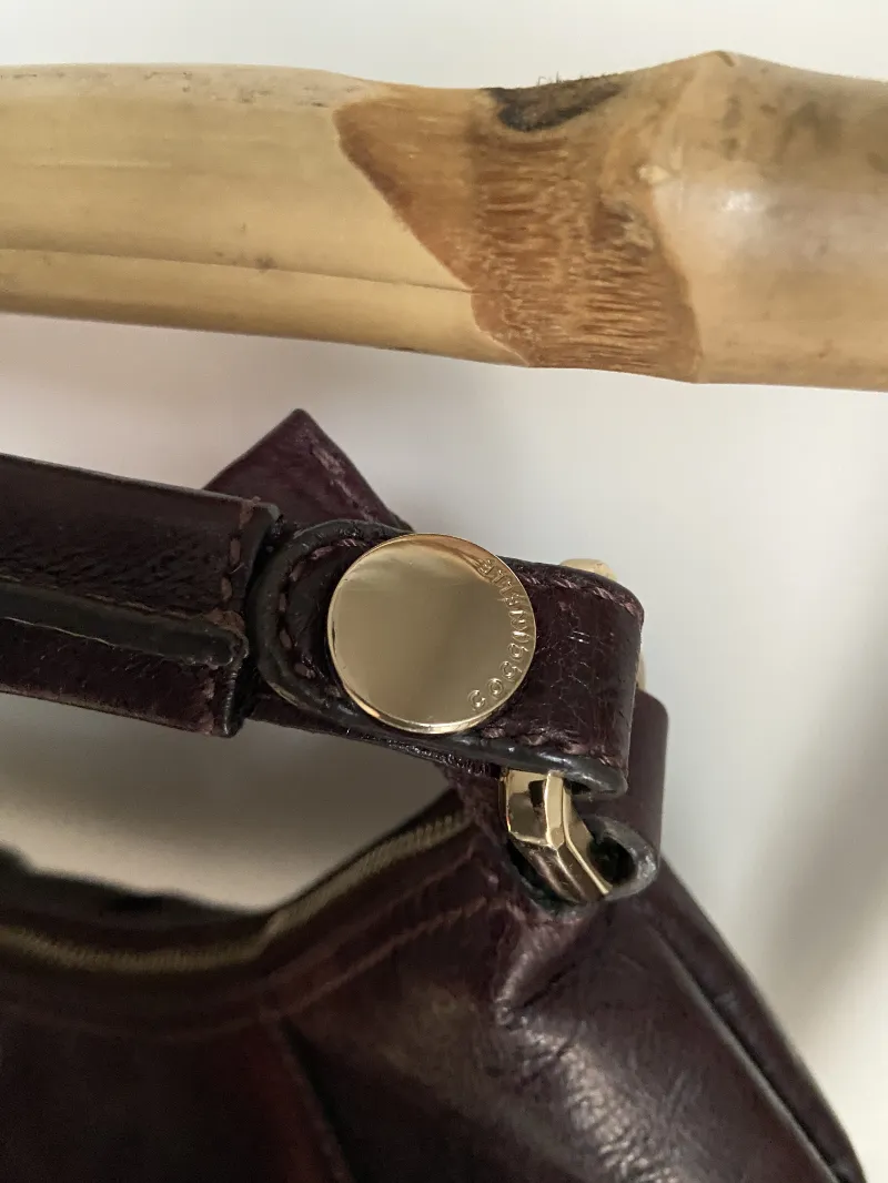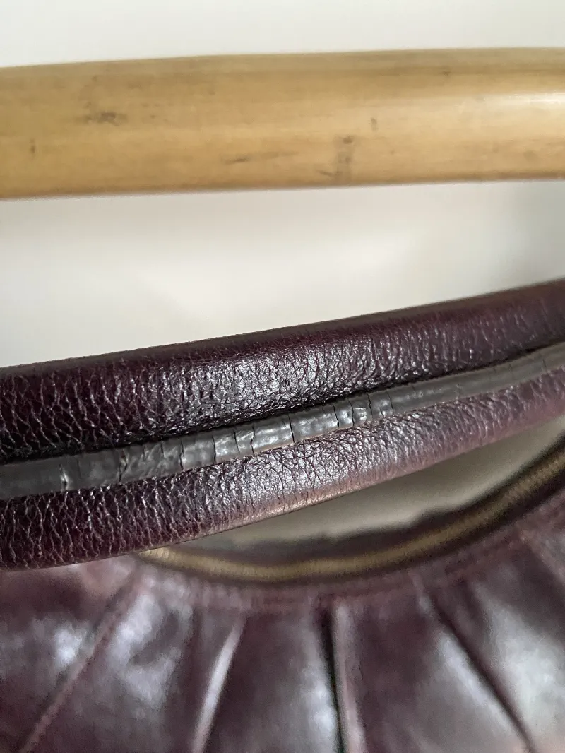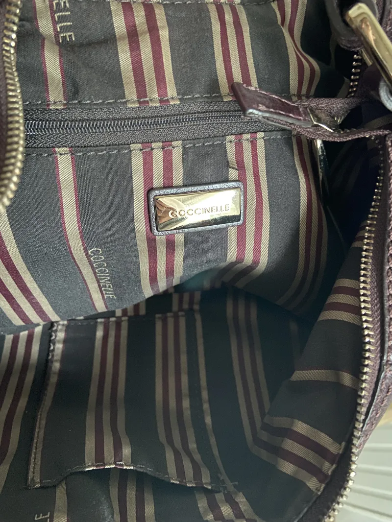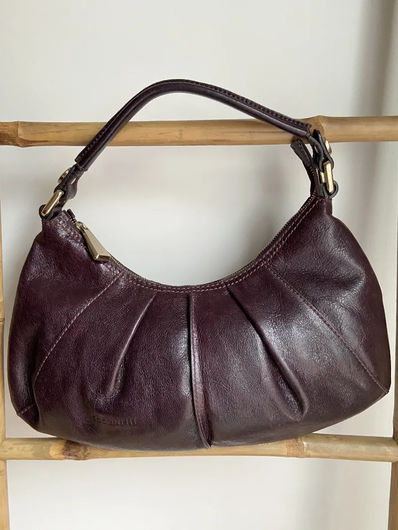 + Frais de portSac à main de la marque italienne Coccinelle. Style demi-lune. Cuir couleur aubergine. Seconde main, chiné par Ta mère en Jean. Pièce unique.